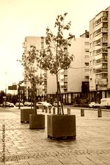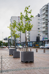 Young city trees in concrete planters along modern urban street with residential buildings and traffic representing landscape architecture, city infrastructure and sustainable urban design