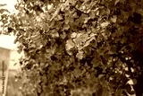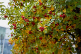 Autumn tree branch with clusters of red berries and green-yellow leaves showing botanical texture, seasonal vegetation and detailed plant structure in natural daylight environment