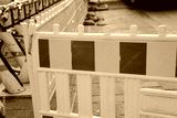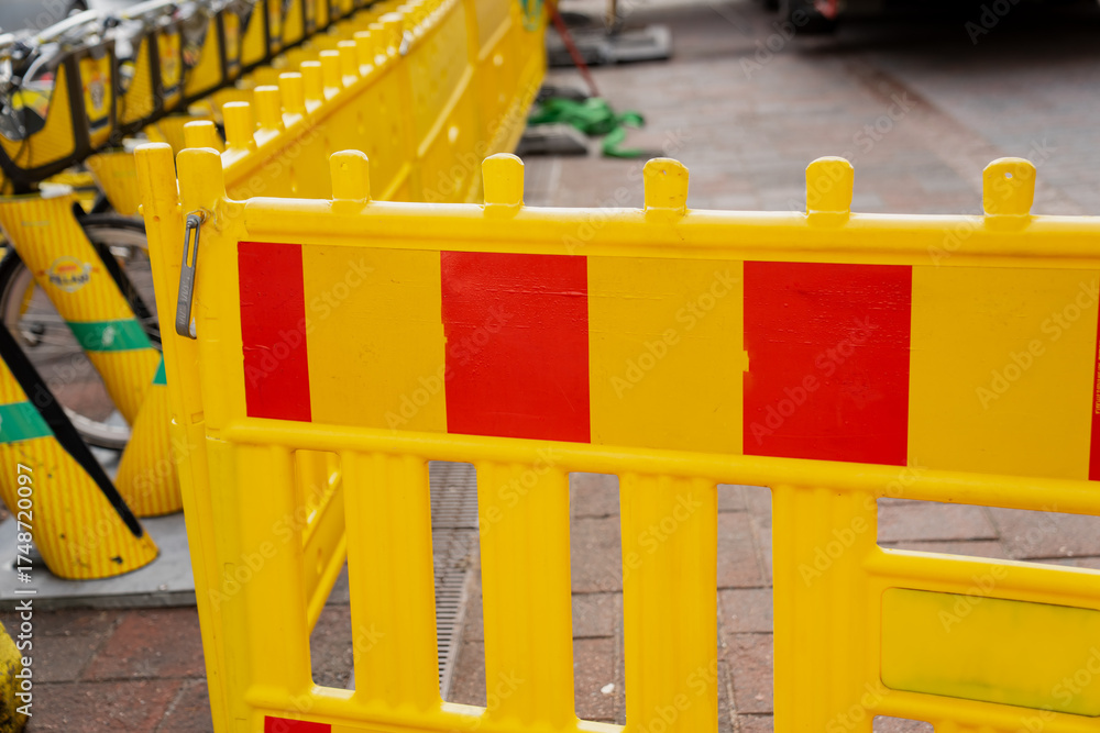 Yellow and red plastic safety barrier blocking construction area on urban street symbolizing public safety, infrastructure maintenance, and temporary traffic control during city repair works