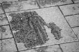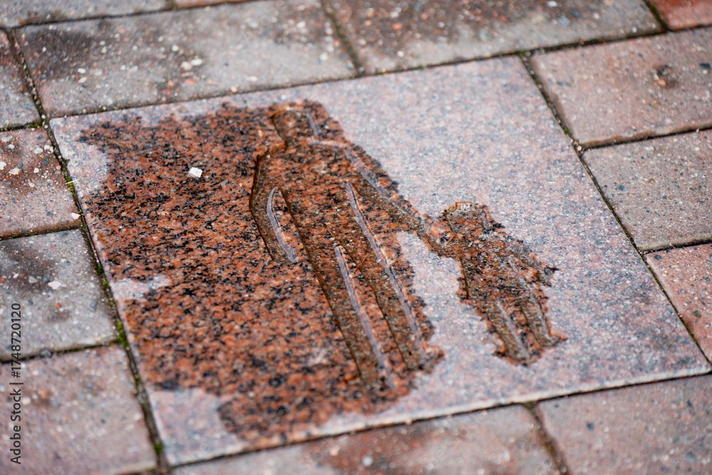Pedestrian walkway tile with engraved symbol of adult and child holding hands representing safe walking zone, urban design detail, and public infrastructure for family-friendly environments
