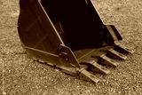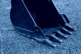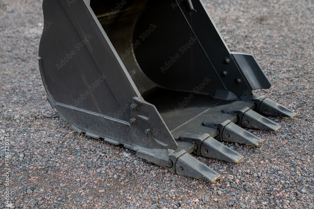 Close-up of excavator bucket with metal teeth on gravel ground representing heavy-duty construction equipment, industrial machinery component, and precision engineering for earthmoving operations