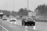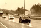 Wet highway scene with multiple cars and trucks traveling in autumn rain showing everyday commuting, reflective surfaces and motion within organized transportation system and seasonal weather