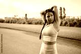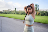 Young African fitness woman in sportswear stretching and warming up arms in a park. Healthy Latina athlete training outdoors, enjoying exercise and lifestyle focused on strength and wellbeing.