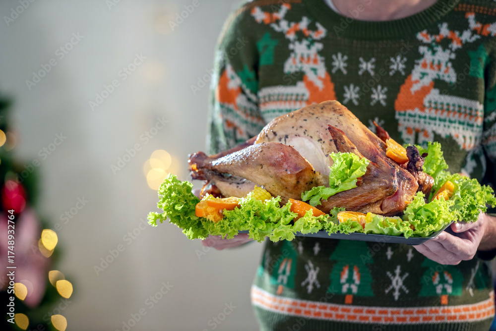 Turkey dinner Thanksgiving food. Man carry Christmas turkey food dinner Serve on table. Baked turkey chicken garnished with family Christmas tree and burning candles . Roasted turkey table setting