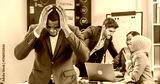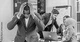 gossip whisper discussion about boss black manager secret mistake problem by Office employee worker colleague in business meeting. gossip whisper head of team in bad news upset unhappy partners.