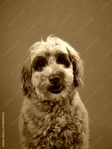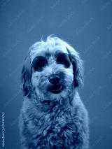 A Labradoodle with curly fur smiles while wearing blue sunglasses, set against a blue background.