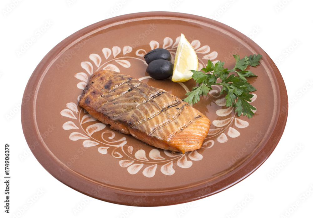 Salmon steak on a clay plate.