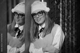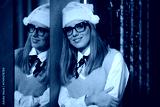 Woman Wearing a New Pair of Eyeglasses and a Santa Hat. Cheerful optical store customer enjoying a Christmas sale
