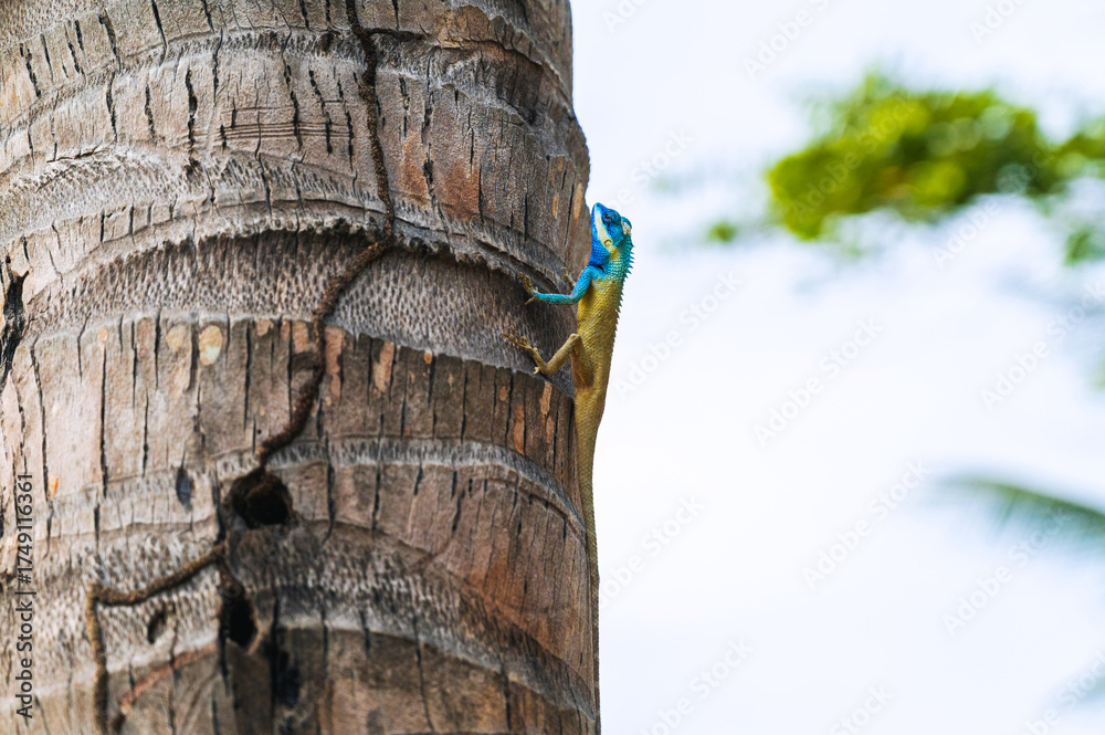 Colorful Vietnamese Blue Crested Lizard or Calotes bachae on a palm tree in the wild in Vietnam in Asia close-up