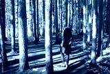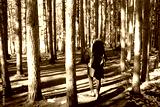 Mom carrying baby in kids hiking backpack in pine tree forest