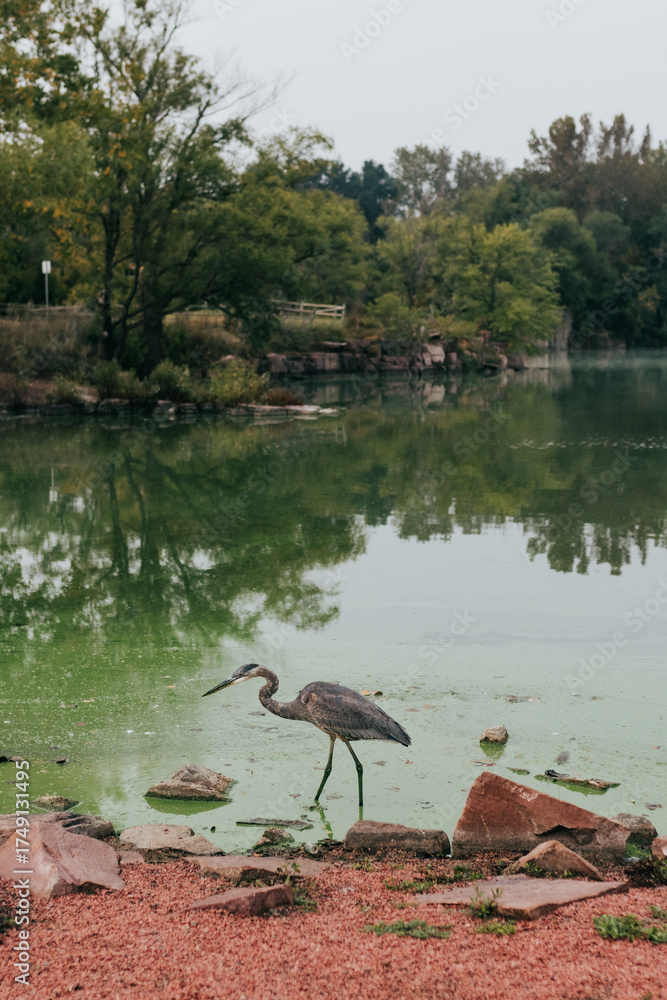 Blue Heron stands in green algae filled pond at waterfowl sanctuary
