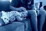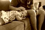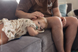 Toddler girl laying on couch while dad pats her head