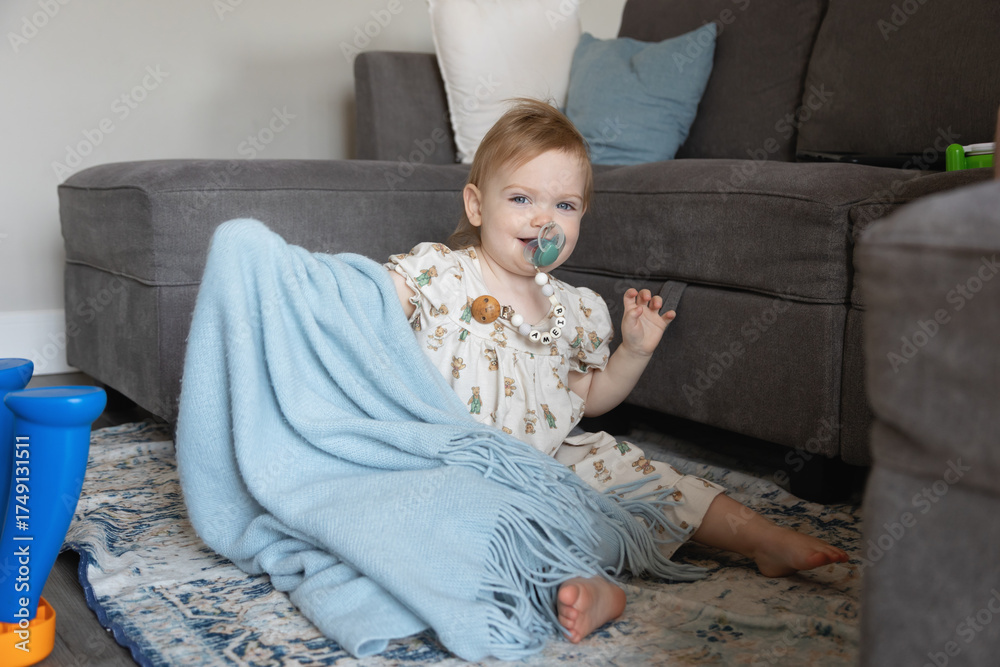 Happy toddler girl plays peek-a-boo under a blanket