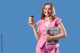 Fashionable young woman in stylish pink suit with paper cup of hot coffee on blue background