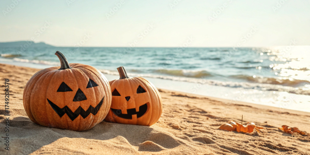 Holiday festival background. Two Halloween carved pumpkins on a sandy beach with morning sunlight in background of a calm sea