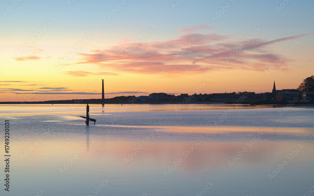 Sunrise seascape of the North Sea over the River Tweed in Berwick-upon-Tweed, England, with golden-pink clouds drifting above the pier, chimney, and church spire, reflected in tranquil waters.