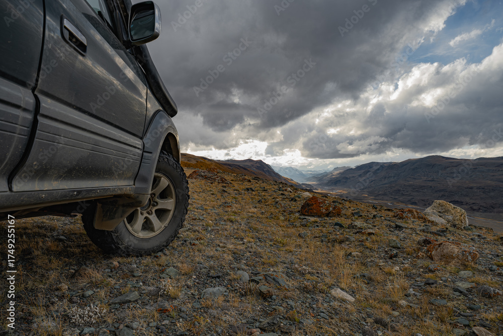 Off-road mud wheel on the background of mountains and blue sky. Drawing of off-road tires. A car wheel on the background of wild nature.
