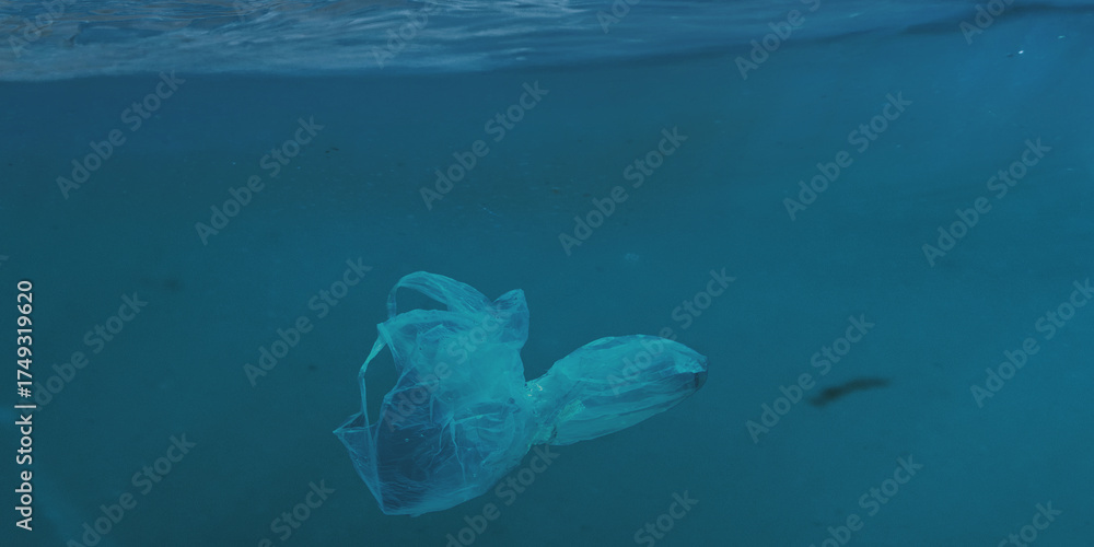 Plastic bag floating underwater in deep blue ocean. Concept of marine pollution, environmental threat, sustainability awareness for NGO campaigns and eco-education visuals.