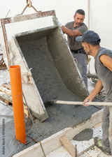 Pouring fresh ready-mixed concrete from wheelbarrow on floor during for construction of a house