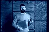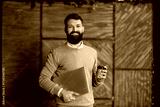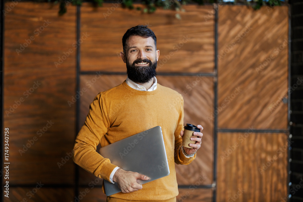 Portrait of a smiling businessman standing with laptop and cup of coffee indoors and looking at camera.