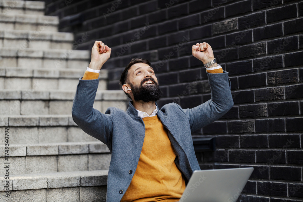 Young overjoyed businessman sitting on stairs with laptop and celebrating victory and good news.
