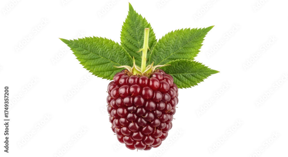 Isolated Raspberry fruit with green leaves, delicious and appetizing, a healthy dessert