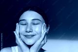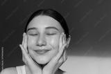 Asian woman with sleek dark hair smiling with closed eyes, gently cupping her glowing face, showing nourished, hydrated, and healthy skin in soft daylight. Skincare beauty routine portrait