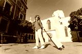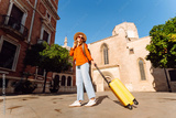 A rear view of female traveler with yellow suitcase and backpack walking through sunlit square. Beautiful woman strolls through streets of old town with small suitcase. Concept: travel, tourism
