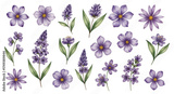 Isolated purple flowers with green leaves for botanical illustration or design projects