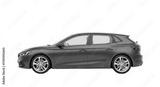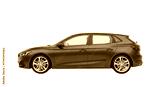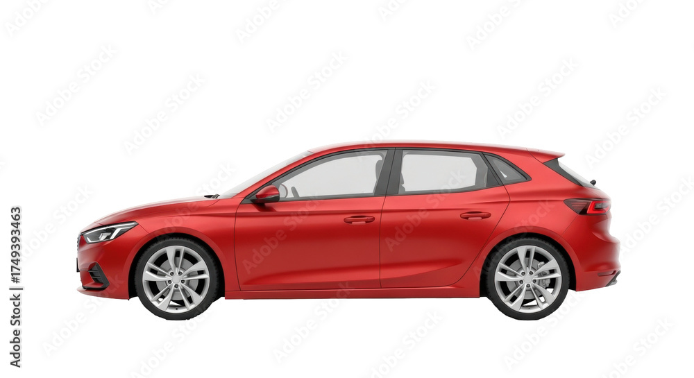 Isolated five-door compact hatchback car with a red paint job, side angle view