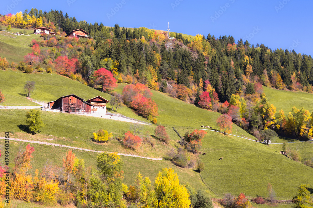 Alpine farmhouses and cows graze on a grassy hillside in autumn