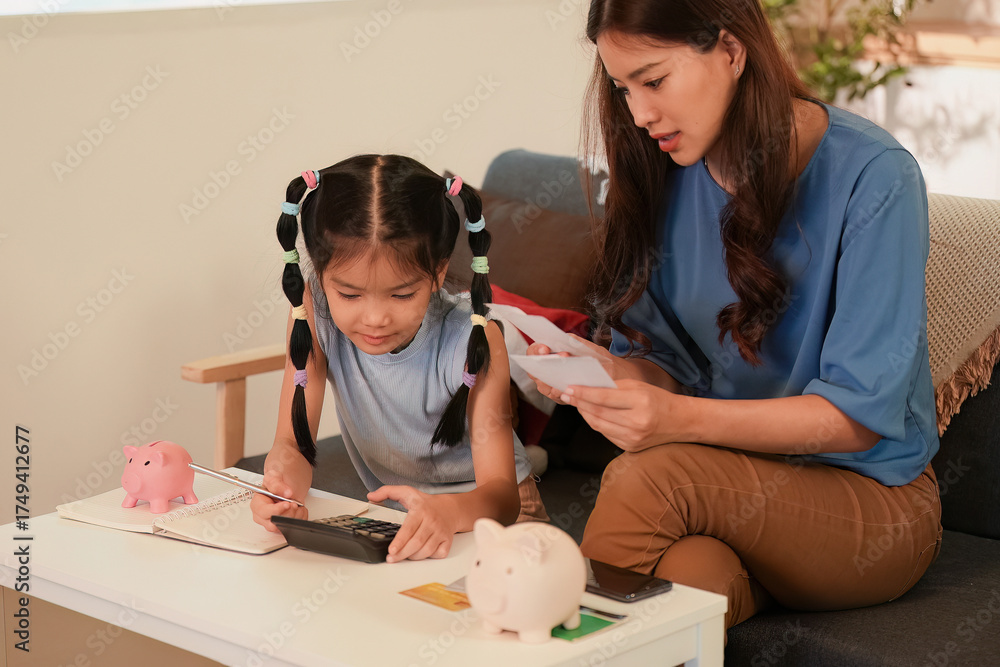 Financial Literacy. Mother teaching daughter about saving money with piggy banks.