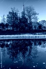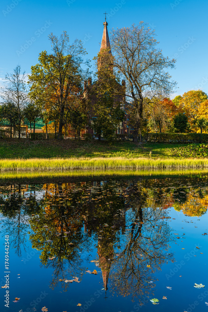 A beautiful autumn landscape with yellow trees reflected in the water. Pushkin, St. Petersburg, Russia.