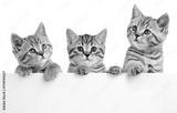 Three cat kittens peeking out of a blank sign, isolated on white background