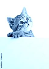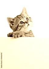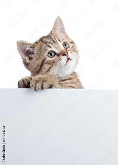 Funny cat kitten peeking out of a blank cardboard, isolated on white background