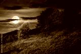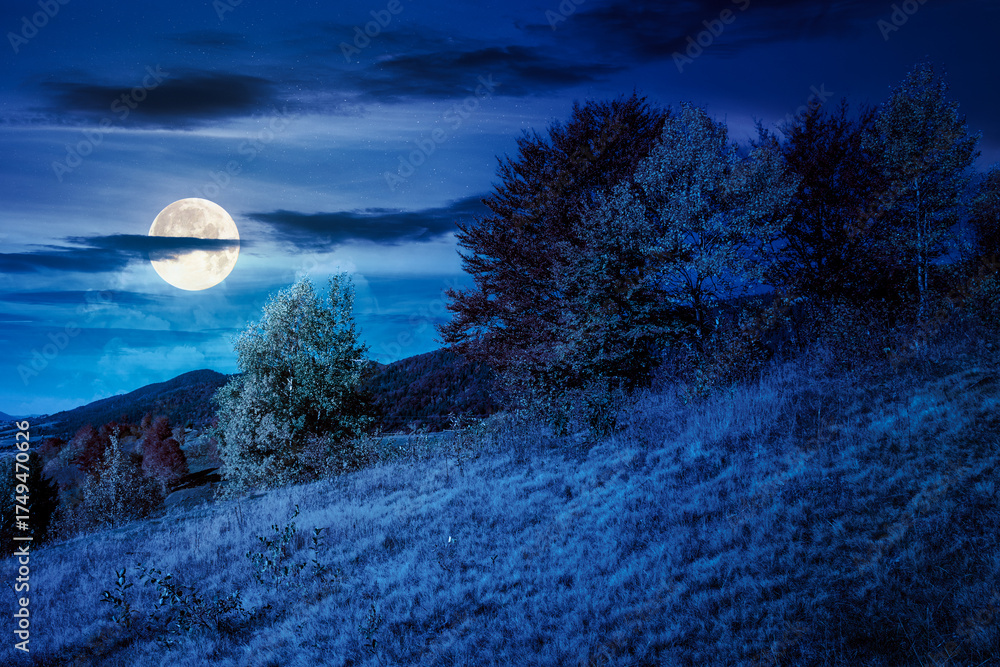 mountain landscape in autumn at night. beautiful view with trees in colorful foliage. picturesque rural place in alps in full moon light. countryside scenery