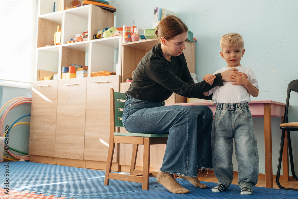 Woman is sitting and checking the boy. Preschool child with teacher during developmental activities in a playroom
