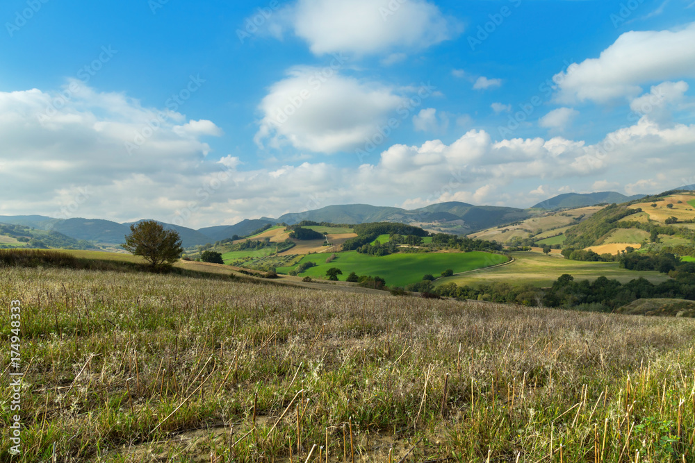 Landscape on a day of september, cultivated fields and blue sky with clouds