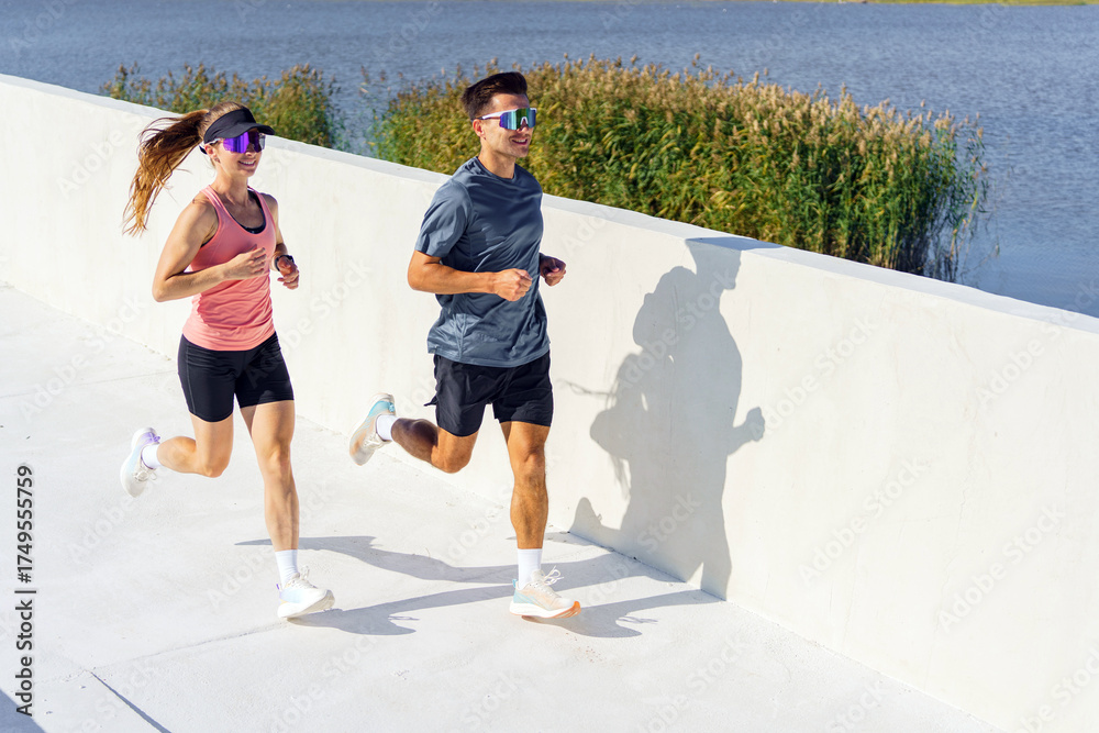 Couple jogging along a waterfront path in sunny weather