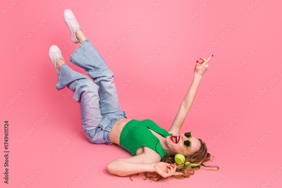 Cheerful young woman in a vibrant outfit enjoying music while posing on a colorful pink backdrop, expressing joy and style