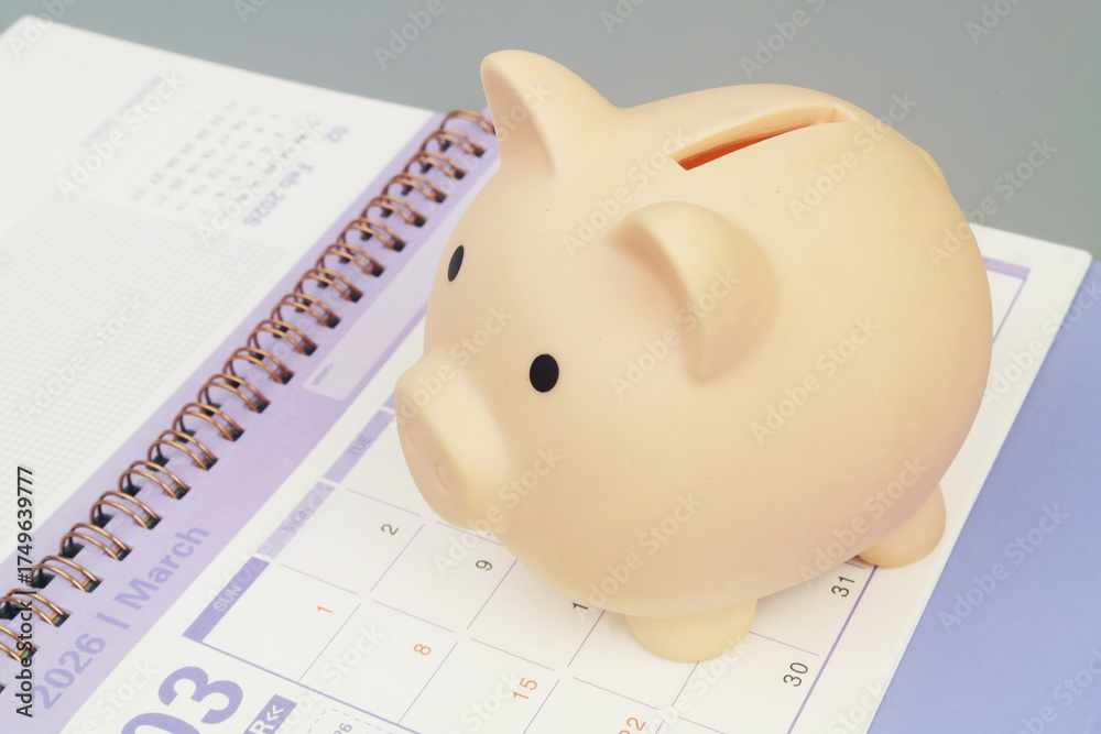 Piggy bank on calendar page close-up. Investment, savings and funding concept.