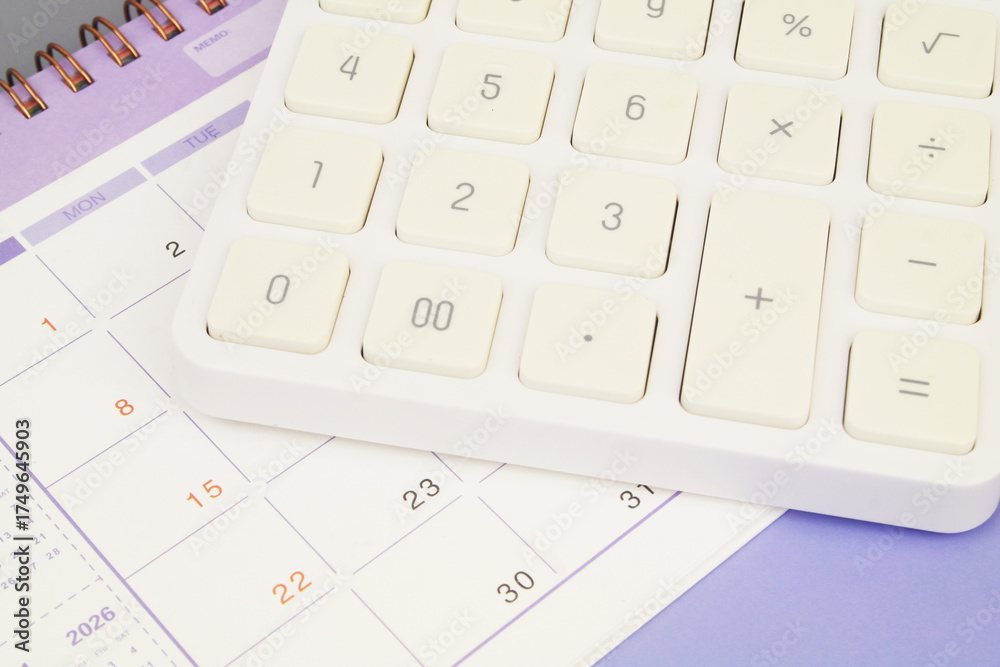 White calculator on calendar page close up
