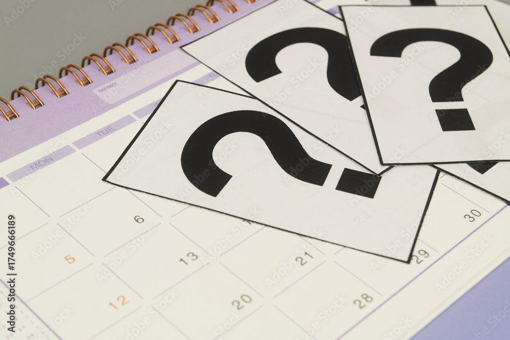 Purple calendar with question marks close up