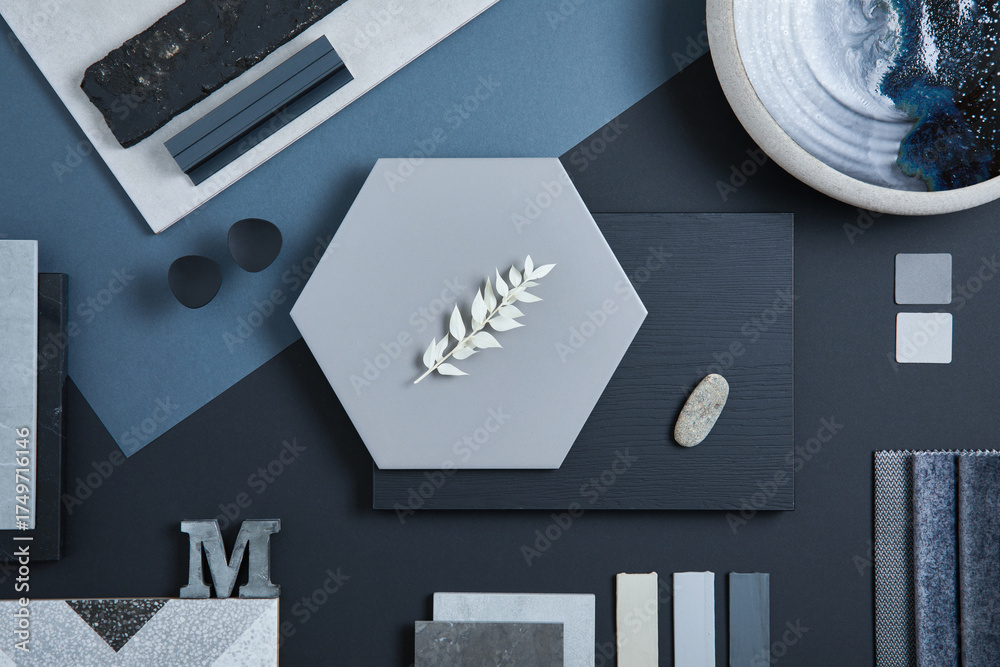 Flat lay of stylish architect moodboard composition with black, beige and grey samples of textile, paint, panels and tiles. Top view. Copy space. Template.