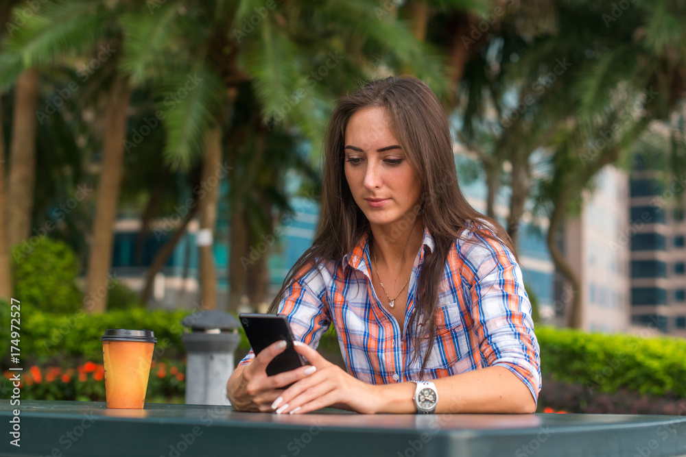 Young woman sitting outdoors reading and typing messages on her smartphone.