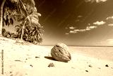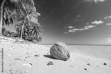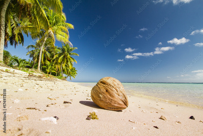 coconut on white sand beach with palm trees