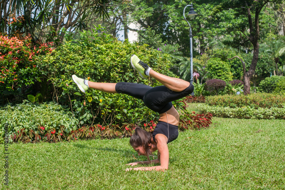 Slim sporty girl drinking water. Fitness young woman taking a break after training in park.