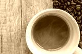 Rising Coffee Prices Concept with Cup and Spilled Coffee Beans on Wooden Table