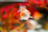 Colorful gold fish in white and orange color is swimming underwater in fish tank. Anima portrait photo, close-up with selective focus.