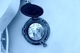 Beautiful vintage porthole on a ship reflecting sunlight and ocean views in a calm sea setting